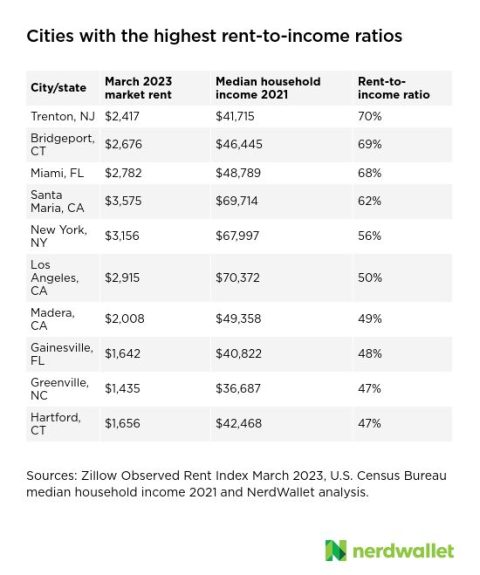 NerdWallet pulled the most recent available market rental data for 529 cities from the Zillow Observed Rent Index and matched it with the most recent available median household income data (2021) for cities by the U.S. Census Bureau. Certain cities identified in the Zillow Observed Rent Index weren’t included in the U.S. Census Bureau list of median household incomes by city and thus weren’t included in this analysis. A total of 225 cities were identified by both sets of data. Then, NerdWallet calculated the rent-to-income ratio using the following formula: Market rent/(median income/12 months).