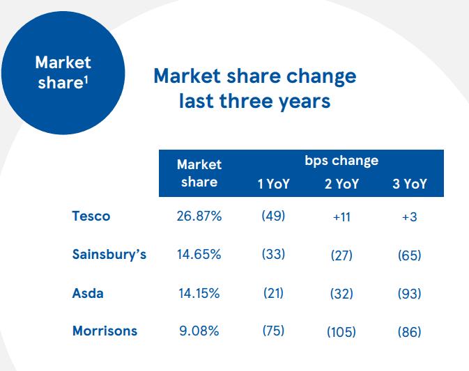 There are some encouraging signs of financial health. In its interim results, Tesco revealed a £0.5bn net debt reduction. It was also the only one of the UK’s traditional ‘big four’ supermarkets to grow its market share over the past three years.