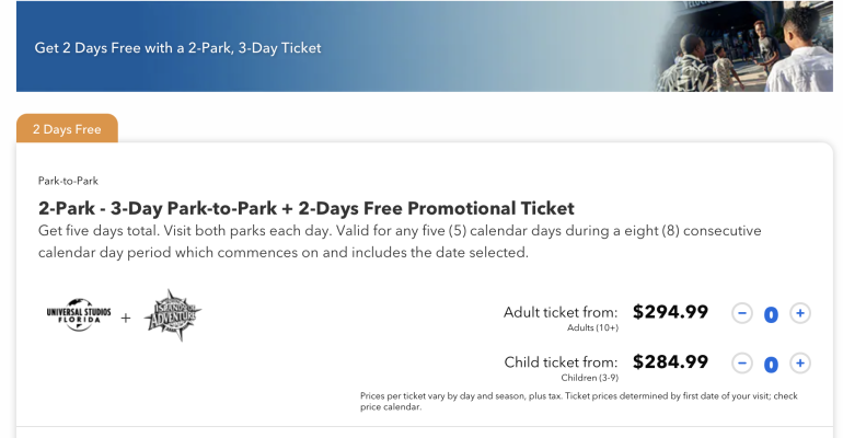 Universal Studios Orlando will often offer promotions allowing you to save money on multiday tickets. This can include promotions such as getting two days free when purchasing two-day tickets.