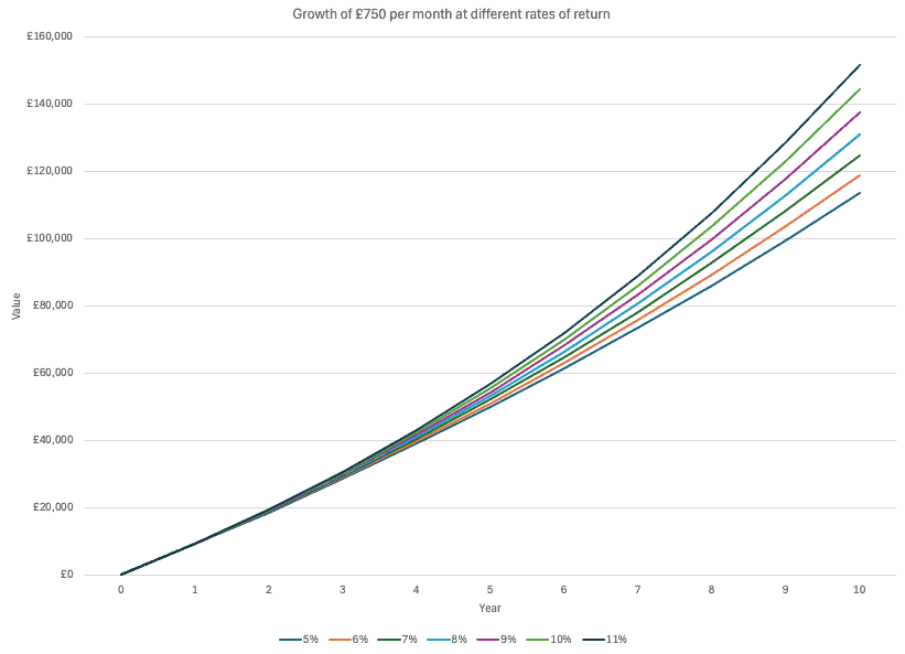 In the chart below, I show how much a £750 contribution a month could grow to at different rates of return. At 5% a year, it could grow to around £115k. At 8% a year, it would grow to around £130k. Meanwhile, at 11% a year, it would grow to around £150k. Bear in the mind that the total amount of contributions over 10 years would be £90,000 (£9k a year). So in some cases, we’re looking at considerable capital gains (tax-free in the ISA).