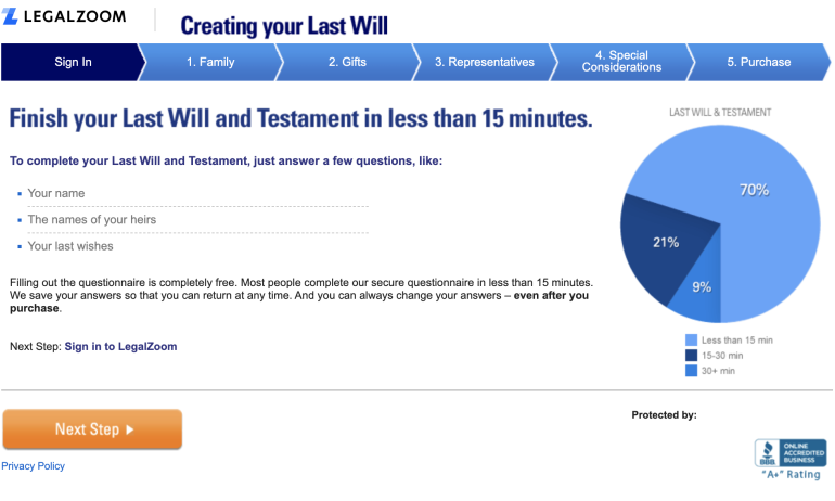 LegalZoom’s online will maker uses a five-step questionnaire covering names, gifts, representatives and special considerations, all of which you’ll fill out before you purchase. After purchasing, you’ll be able to download and print the completed documents.