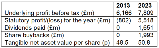 The table below shows some key numbers Lloyds reported in its 2013 and 2023 results.