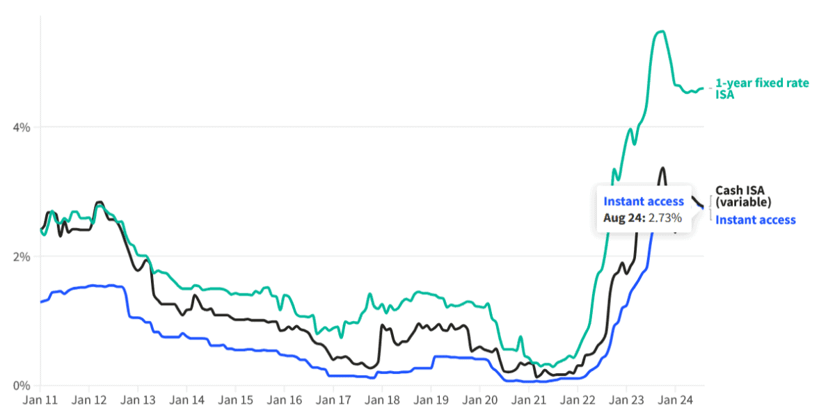 Today, one of the best easy-access Cash ISA on the market offers a healthy 5.12% interest rate. As the chart below shows, the average rate for these tax-friendly products is comfortably ahead of what savers enjoyed between 2011 and 2022.