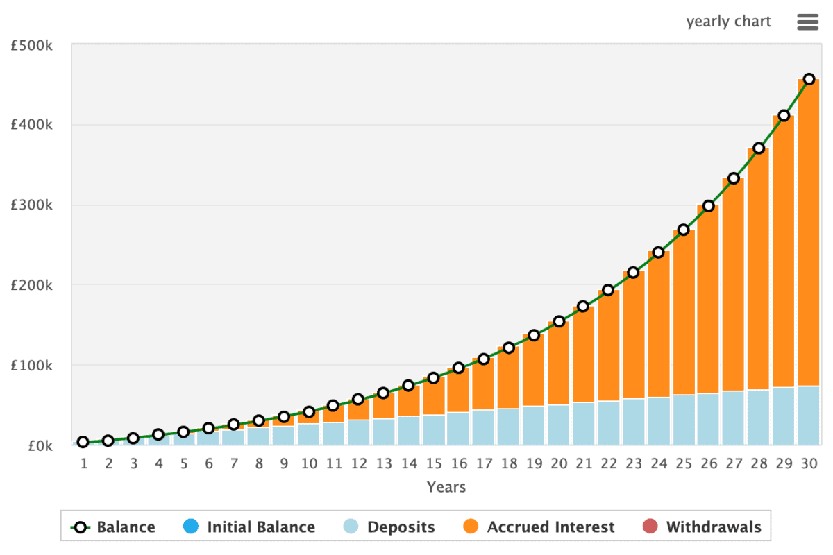 Moreover, with time I can benefit from compounding — this is a key ingredient when investing. Compounding happens when I reinvest my returns year after year. This then allows me to earn returns on my returns.